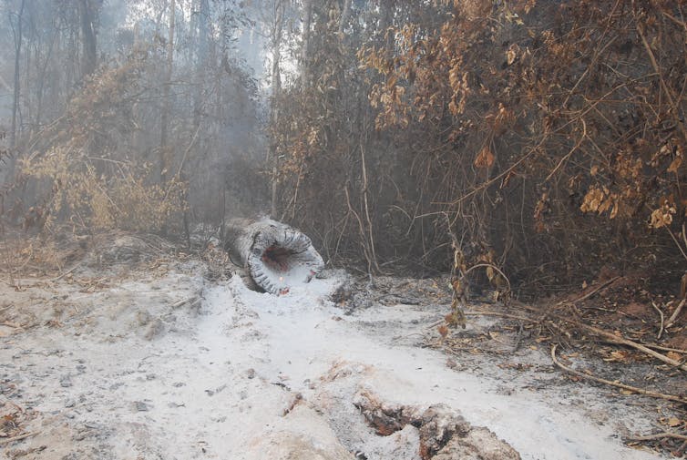 Smouldering tree trunk after a forest fire during the 2015 drought in eastern Amazonia. Image: Erika Berenguer/author provided.