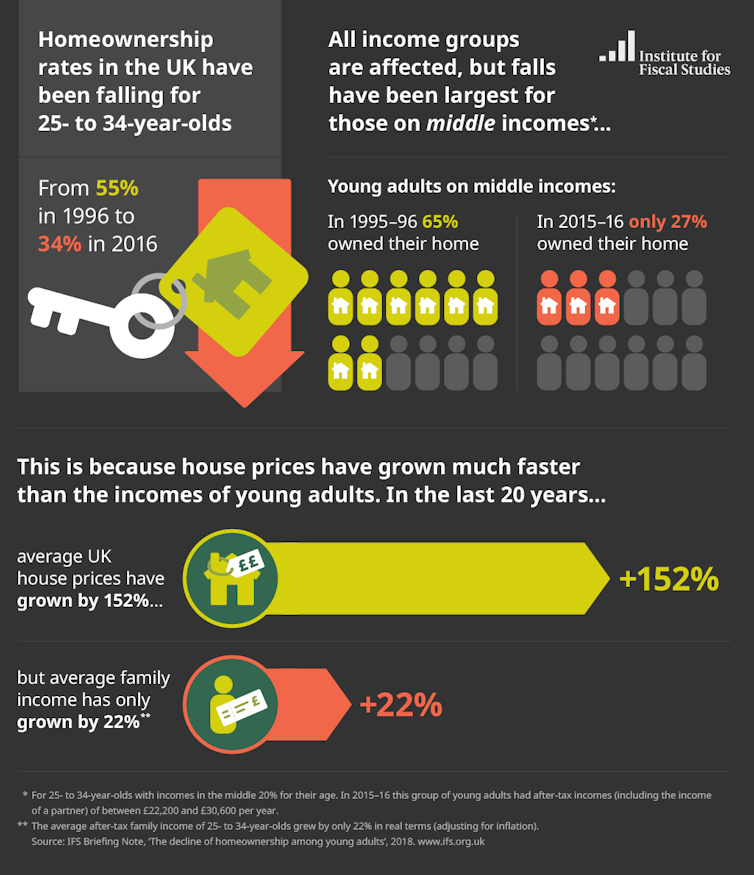 The IFS study lays the blame for all this on the growing gap between house prices and incomes. Adjusting for inflation, house prices have risen 150 per cent in the 20 years to 2015-16, while real incomes for 25 to 34-year-olds have grown by 22 per cent (and almost all of that growth happened before the 2008 crash).