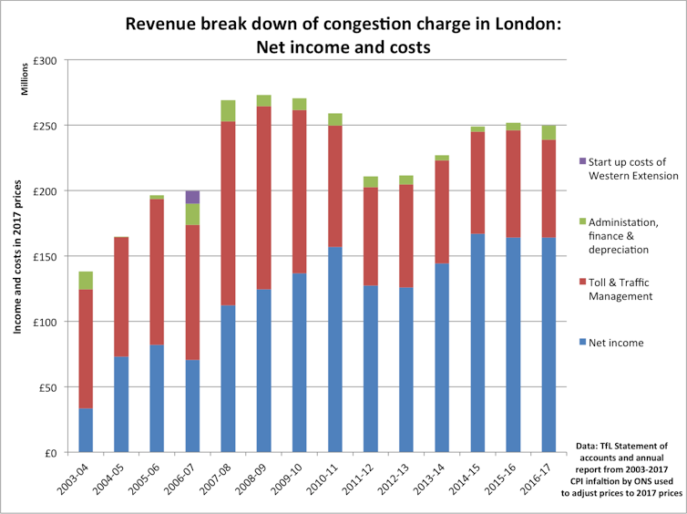 Breakdown of revenue collected each year from the congestion charge, and the net income after costs accounted for. Image: author created from Transport for London Statements of Accounts and Annual reports for years 2003 to 2017.