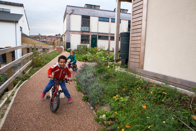 Kids play on bikes at Lilac co-housing community, Leeds. Image: © Paul Chatterton/author provided.