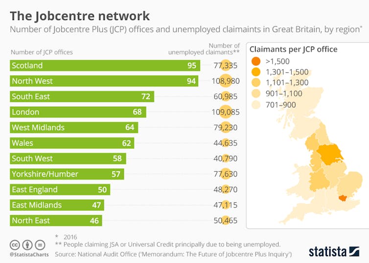 And all this is happening just as the number of unemployed claimants has started to increase and the roll-out of the new, catch-all benefit called Universal Credit, is accelerating. By the end of 2018, most new working age claimants in Britain, will be claiming Universal Credit – and many of them will be required to attend jobcentres. The already intense pressure on a shrinking network of jobcentres will increase further in 2019 when the Department for Work and Pensions (DWP) will begin moving millions of existing benefit claimants onto Universal Credit.