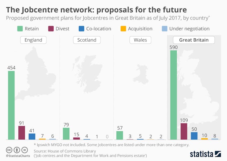 But Britain’s national network of jobcentres is currently undergoing radical change as the government implements multiple welfare reforms and cuts as part of its continued austerity drive. Between 2016 and 2018, over 100 jobcentres – about 15 per cent of the network – will have closed.