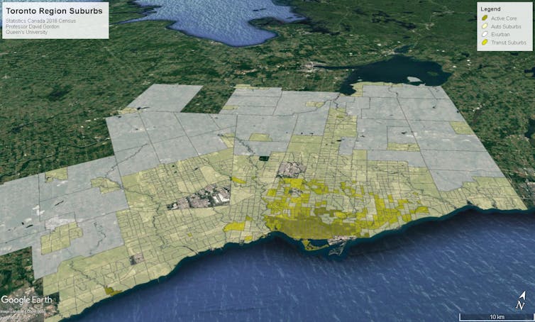As you can see in the above Google Earth map of the Toronto area, we classified the neighbourhoods in Canada’s Census Metropolitan Areas (CMAs) into four types: