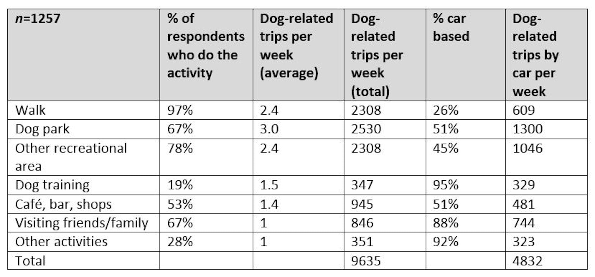 Our study, involving more than 1,250 Sydney dog owners, looked at popular activities owners do with their dogs and how often these require a trip by car. Typical activities include: