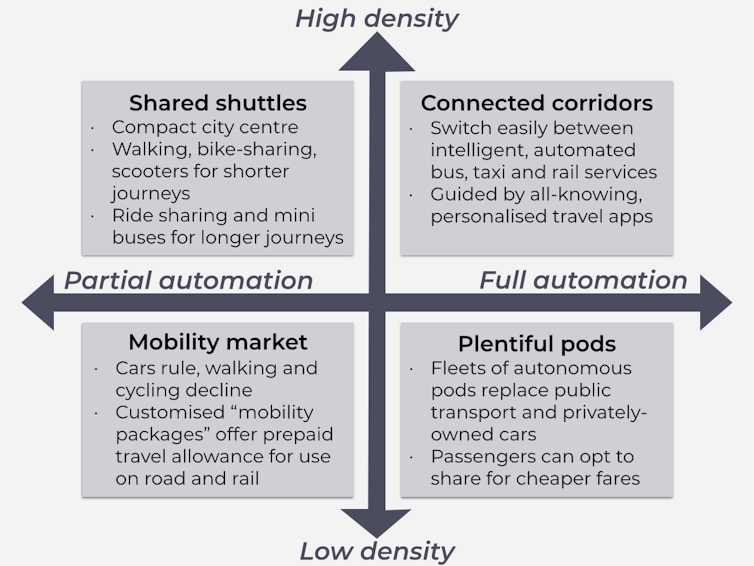 The first axis considered automation – at one end, vehicles are still be driven much like today (partial automation). At the other, they’re driverless (full automation). The second axis related to how dense cities could become – one future where the population is more dispersed (like Los Angeles) and another where it is concentrated at a higher density (more like Hong Kong). With these axes in mind, I generated four possible futures for public transport, which could play out in cities across the world.