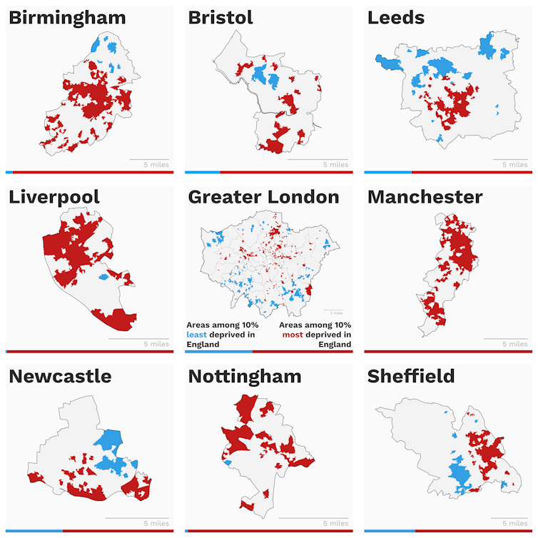 Looking at the data for English cities, the problems with mapping inequality become clearer. The maps below show eight major English cities, plus Greater London. Areas shown in red are among the 10 per cent most deprived in the whole of England, whereas the blue areas are among the 10 per cent least deprived. The ratio of red to blue areas is shown in the bar along the bottom of each city map.
