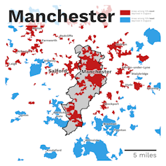 Some cities look very deprived, others are quite mixed. In Sheffield in particular you could almost draw a straight line between the red and blue areas. Where boundaries are drawn matters a lot. Take Manchester, for example: its official boundary doesn’t include places which are functionally part of the city, such as Salford, where a lot of people work.