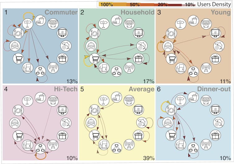 Our six lifestyle groups: the colour of the arrows represents the frequency of the transactions, from yellow (most frequent) to red (less frequent). Image: Riccardo Di Clemente et al./author provided.