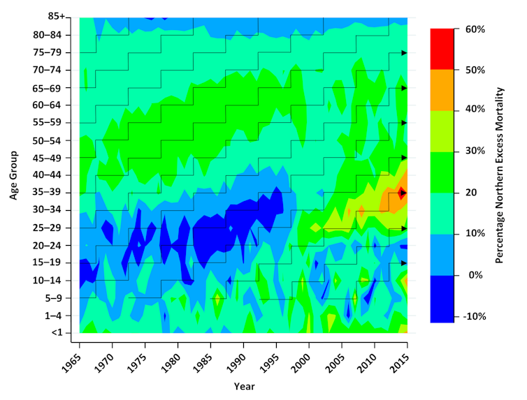 In 1995, there were 2% more deaths among northerners aged 25 to 34 than southerners (in other words, 2% “excess mortality”). But by 2015, northerners in this age group were 29% more likely to die than their southern counterparts. Likewise, in the 35 to 44 age group, there was 3% difference in mortality between northerners and southerners in 1995. But by 2015, there were 49% more deaths among northerners than southerners in this age group.