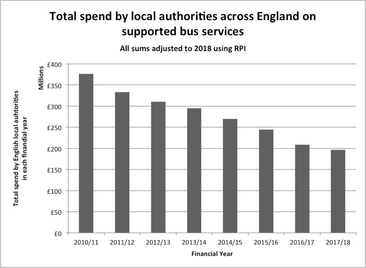 Local authority spend on buses in England for each financial year from 2010 to 2018. Image: Buses in Crisis Report.